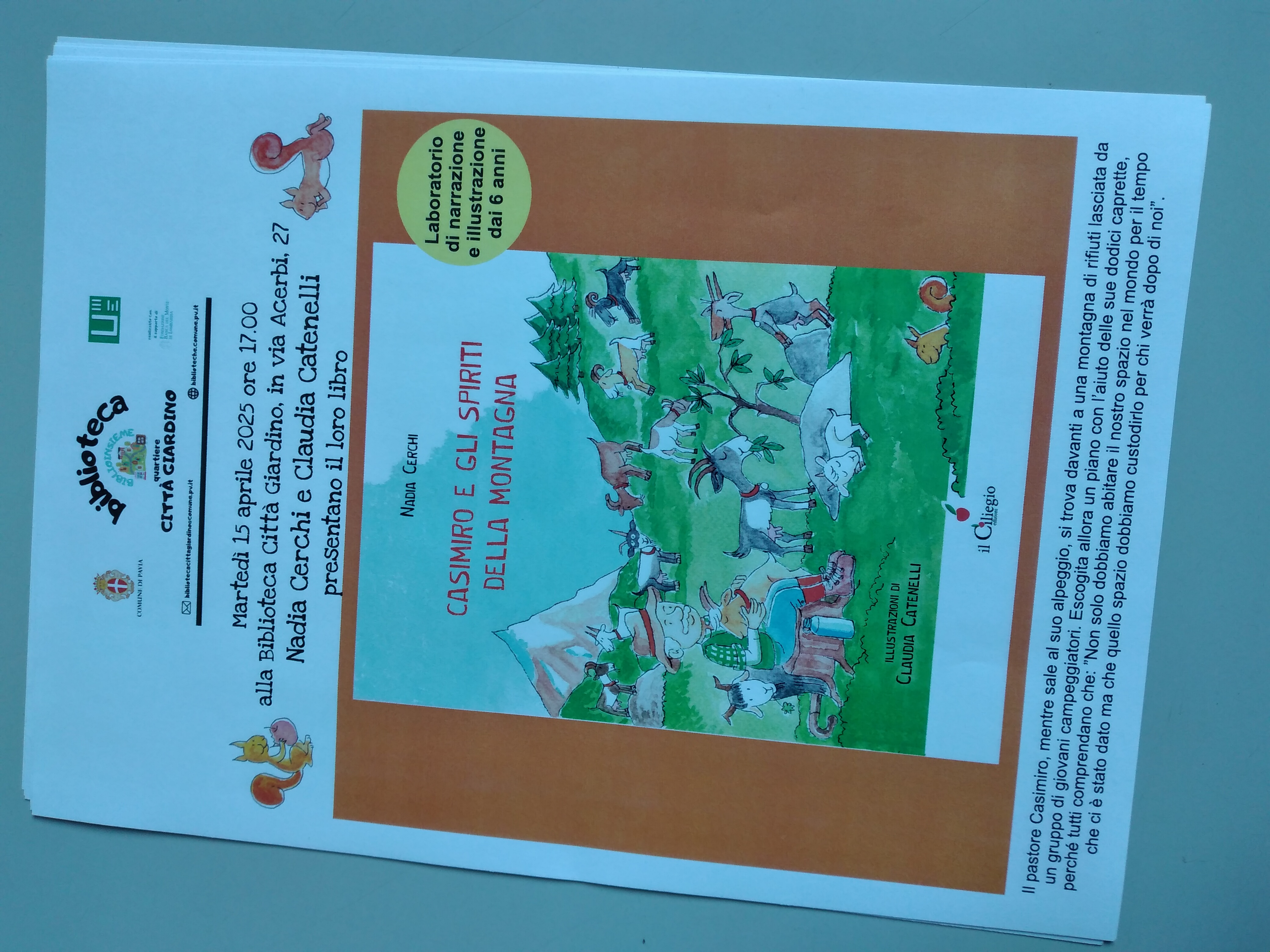 Martedì 15 aprile, alle ore 17.00, presso la Biblioteca Quartiere Città Giardino, via Acerbi 21, Pavia, si svolgerà un laboratorio di narrazione e illustrazione dedicato ai bambini dai 6 anni nel corso del quale Nadia Cerchi e Claudia Catenelli presenteranno il loro libro "Casimiro e gli spiriti della montagna".