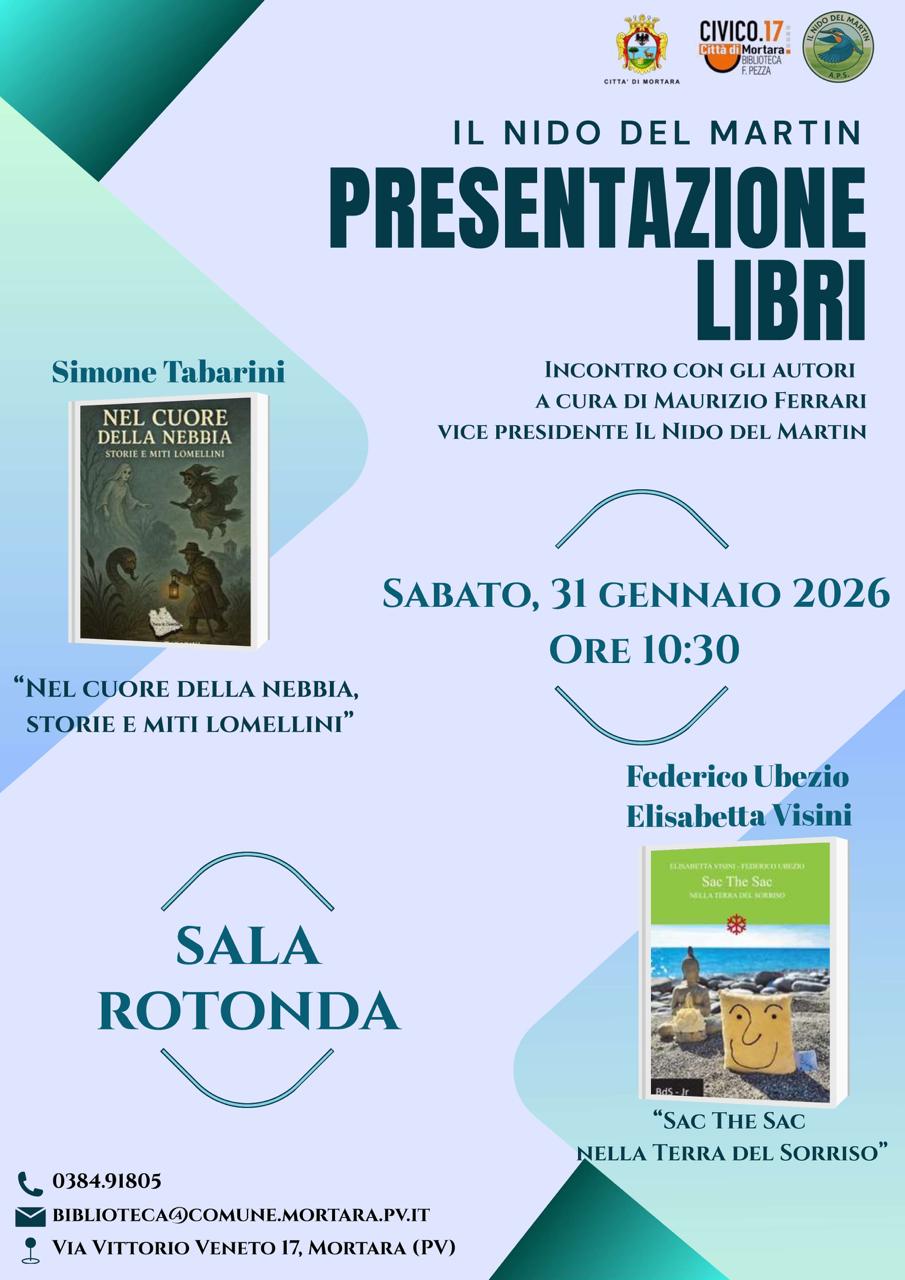Presentazione dei libri "Nel cuore della nebbia. Storie e miti lomellini" di Simone Tabarini e "Sac the sac nella terra del sorriso" di Federico Ubezio e Elisabetta Visini. Sabato 31 gennaio ore 10,30.